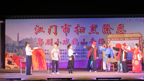 晚会在《扫黑除恶展新貌》大联唱中拉开了序幕,谐趣小戏《游客当官记》、群口快板《爱民书记》、小品《闹圩场》、粤剧小戏《保护伞》等融合扫黑除恶宣传内容的节目轮番登场,丰富多彩、精彩纷呈,赢得了现场观众阵阵掌声,气氛十分热烈。