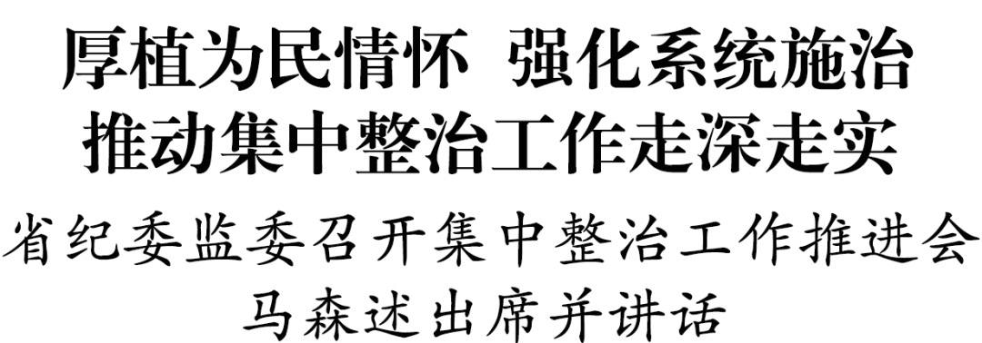 马森述强调,要进一步提高认识、强化责任担当,深刻学习领悟习近平总书记关于党的自我革命的重要思想,始终怀着对人民的深厚感情,以强烈的责任感、使命感、荣誉感,增强抓好集中整治的主动性,用心用力用情解决群众急难愁盼,不断厚植党的执政基础,以实际行动践行“两个维护”。要围绕中心、服务大局,强化政治监督,推动各地各部门将集中整治与“百千万工程”有机融合,聚焦“百千万工程”重点项目实施,将集中整治嵌入其中,助力解决好城乡区域发展不平衡问题,破除影响广东高质量发展的最大短板。要坚持守底线、追求高标准,广东作为改革开放的排头兵、先行地、实验区,集中整治必须立标杆、作示范,及时查处冲击道德底线、纪法红线,损害群众利益的不正之风和腐败问题,深化系统施治,着力铲除腐败滋生的土壤和条件,提升基层治理体系和治理能力现代化水平,彰显党的领导和中国特色社会主义制度的显著优越性。要立足当前、着眼长远,解决沉疴积弊不可能毕其功于一役,要把“总体战”和“歼灭战”结合起来,既锚定长远目标,又明确阶段性任务,每个阶段突出重点、挂图作战,不断积小胜为大胜,以点带面推动各领域全方位整改治理,让人民群众看到实实在在的变化。要融入日常、抓在经常,牢记纪检监察职责使命,以强监督压实责任,督促各级党委政府和职能部门形成共识,自觉把集中整治作为分内之事、应尽之责,切实融入日常履职当中,把自己摆进去、把职责摆进去、把工作摆进去,主动作为,借集中整治的东风治理行业乱象、规范权力行使、提升治理水平。要守正创新、敢为人先,发扬广东敢闯敢试的精气神,进一步完善集中整治领导体制和工作机制,勇于打破利益藩篱、破除顽瘴痼疾,善于用改革的办法、创新的思维从源头上解决问题,健全维护群众利益长效机制,让人民群众的获得感、幸福感、安全感更加充实。